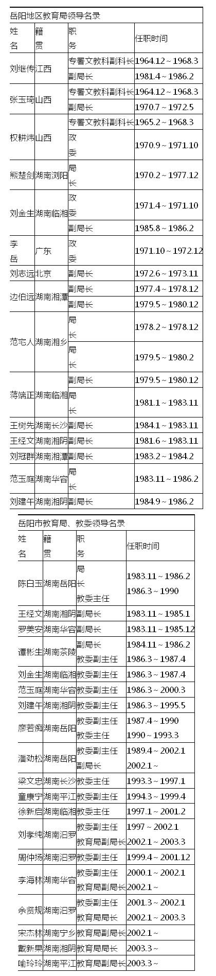 1964年9月,岳阳专署设文教科,干部7人,主管岳阳、华容、临湘、平江、湘阴五县和君山、屈原、建新、钱粮湖、黄盖湖农场的教育行政工作。1966年“文化大革命”初期,文教科瘫痪。1967年地区革命委员会(以下简称革委会)成立,设立文卫组,工作人员3人。1970年,设岳阳地区教育局,下设