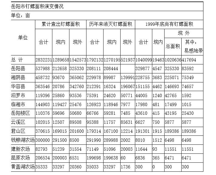 由于洞庭湖泥沙淤积,洲滩面积逐年扩大,垸外钉螺面积不断增加,垸内有螺面积也因陆续发现新螺点及部分垸外面积转为垸内等原因而增多。至1999年底,累计查出钉螺面积2832231亩,其中垸内 1289658亩,垸外1542573亩;累计消灭钉螺面积1792132亩,螺情下降63%,尚有钉螺面积1040099亩,其中垸内19463亩,垸外1020636亩,垸外钉螺面积中属于易感地带的有417694亩。