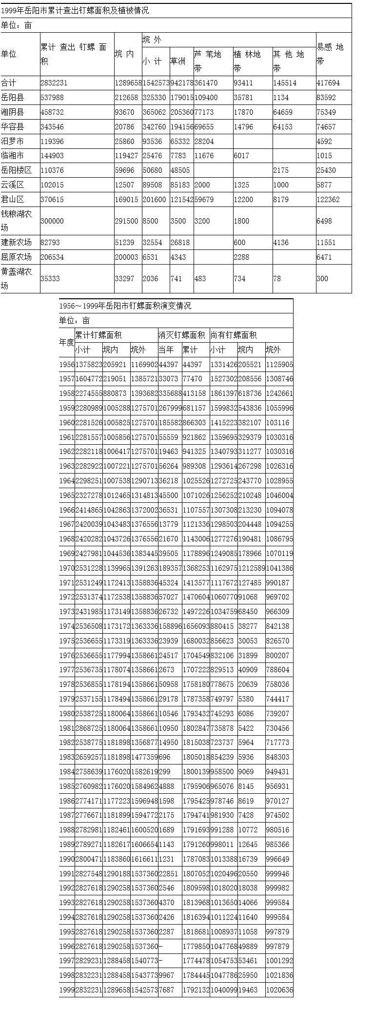 1989年10月,华容县血防站发现有急性血吸虫病患者来自华容河流经的城关镇李家湖村,经追踪调查感染地点,新发现华容河钉螺面积1260亩,钉螺平均密度每框9.63只,阳性螺平均密度每框0.53只。