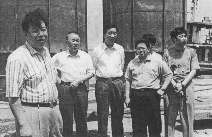 市委书记阳宝华(左一)、副市长罗碧升(左三)在洞庭大桥施工现场了解情况。