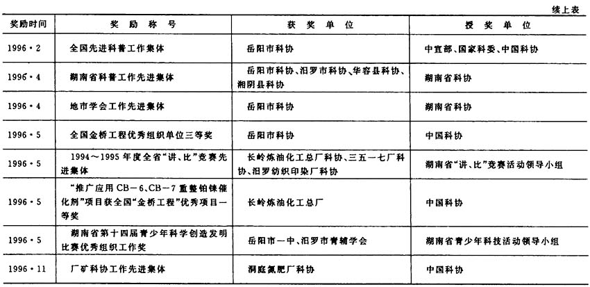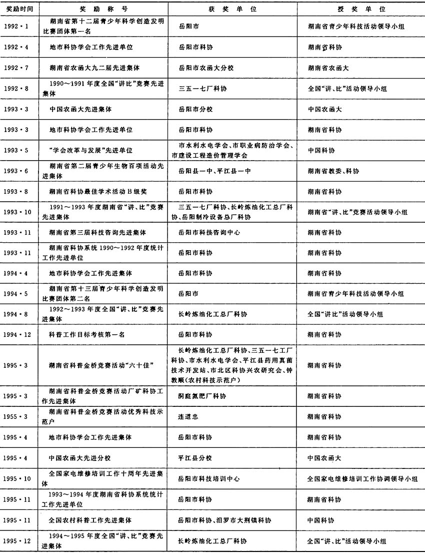 岳阳市科协系统受到国家和省奖励情况(1992~1996)