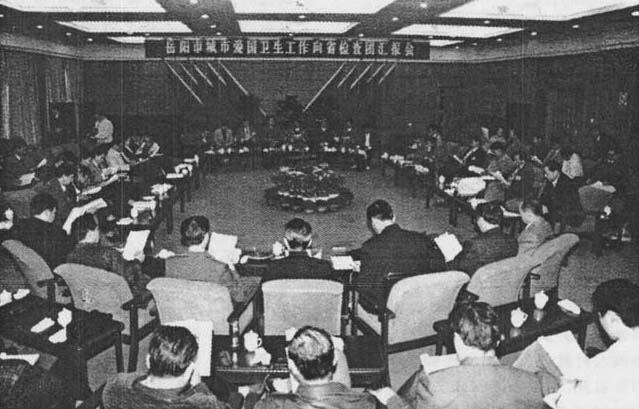 市委、市政府领导向省检查团汇报岳阳币城市爱国卫生工作情况,