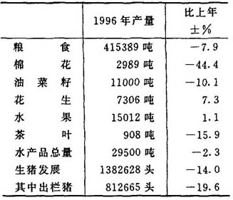 农业基本形成了种养加、贸工农一体化的经营格局,以“山水湖”工程为主体的农业综合开发,为农业产业化发展迈出了坚实的第一步。全县新开发丘岗山地面积2.92万亩,改造低产茶园4.6万亩,新扩水果面积1.32万亩,新植楠竹1.1万亩,新造松杉林6190亩,推广旱地杂交玉米1.1万亩,果林间作物7.6万亩,发展黑山羊、菜牛2万多头。鸭业工程突出示范基地建设,实行基地连农户,发展工程鸭15.07万羽。麻塘、中洲、城关三个农业综合开发项目区,首期投资535.04万元,完成土地治理面积3.5万亩,高标准立体开发水面7000亩,建立高产水稻、玉米示范基地6个、共8000亩,三个项目区建设以其设计合理、工程量足、标准高被评为全省农业综合开发洞庭湖区一等奖。蔬菜生产进入全省14个基地县行列,商品菜种植面积达到14万亩,实现产值2.3亿元,成为新的农业支柱产业。1996年,全县粮食作物播种面积117.33万亩,总产41.5万吨,由于境内山洪暴发,外湖超历史最高水位的洪涝灾害的影响,几项主要农产品产量均有所下降,农业总产值97767万元,比上年减少4.9%。岳阳县1996年主要农产品产量:
