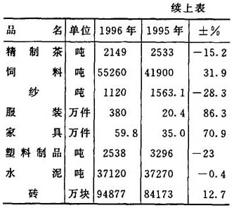 工业重点围绕扭亏增盈,转换经营机制,加强技术改造,优化经营环境,强化企业内部管理,全县工业整体素质有所提高,产销同步增长,效益明显好转。全年完成工业总产值17.6亿元,比上年增长20%.其中乡以上工业总产值完成11.2亿元,全县乡以上独立核算工业企业共272个,其中盈利企业255个,盈利总额5412.6万元。实现利税总额9710.1万元,比上年增49.1%。县直工业大胆制订一厂一策的改革方案,对县酒厂、纺织厂、机瓦厂、钢木家俱厂、皮鞋厂分别进行了依法破产,启动了新的运行机制,企业活力大为增强。全县工业逐步形成了轻纺、建材、机械、服装、造纸、食品加工、矿产等7大支柱产业,独立核算工业企业拥有固定资产3596.92万元,年末职工人数36487人,主要工业产品有32个。岳阳县1996年主要工业产品产量: