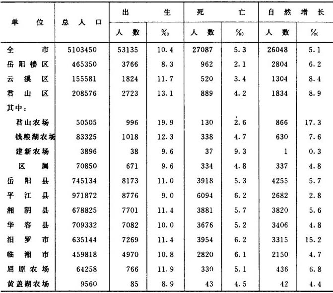 自然变动 1997年末,全市共出生婴儿53135人,出生率为10.4‰;死亡27087人,死亡率为5.3‰;自然增长26048人,自然增长率为5.1‰。各县(市)、区人口自然变动情况分别是: