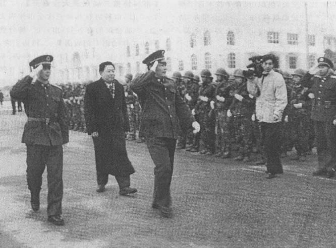 1月24日,岳阳市举行大规模民兵军事汇报表演。这是省军区司令员庞为强在市委书记阳宝华、岳阳军分区司令员李继军陪同下检阅民兵方阵。