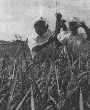 市农科所选育的优质稻品种湘晚籼9号于1992年选育定型,至1997年,累计推广面积500万亩,社会效益达10亿元。图为科研人员向市委副书记黄甲喜介绍该稻生长情况。