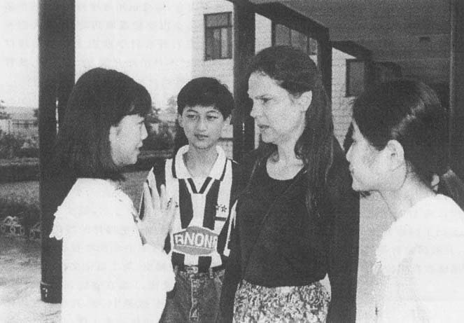 市八中学生与美籍英语教师交流英语学习情况。