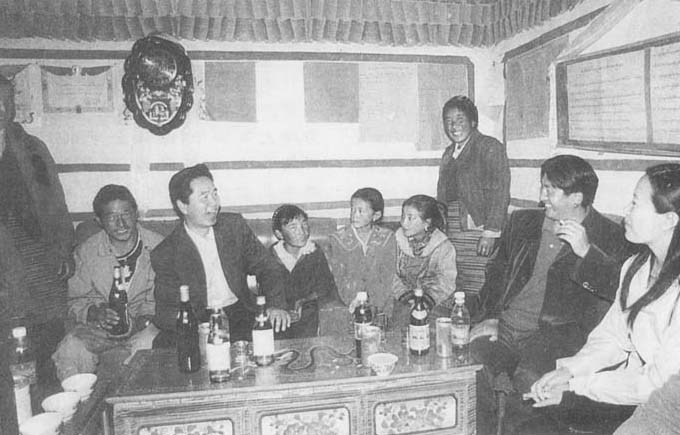 岳阳市援藏干部、西藏桑日县县委书记殷清华(左三)深入藏民家庭了解情况。