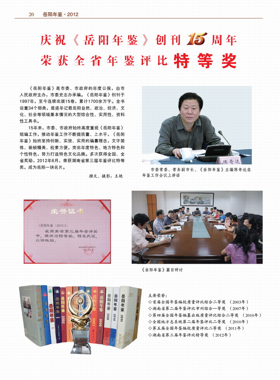 庆祝《岳阳年鉴》创刊15周年荣获全省年鉴评比特等奖