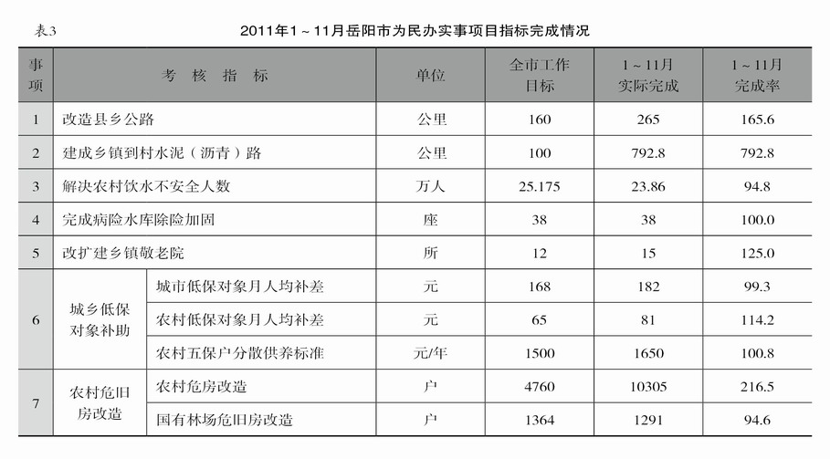 【各项目标任务全面完成】2011年,岳阳市各项目标任务全面完成,呈现经济社会发展充满活力、优势产业不断壮大、项目建设成效显著、民生建设收到实效、发展环境不断优化等诸多亮点。开展为民办实事工作,解决群众关注的热点难点问题,全市民生支出占到财政总支出的70%,省政府下达岳阳的32个为民办实事项目有38个考核指标,至11月,有25项指标超额完成,13项指标全面完成任务。