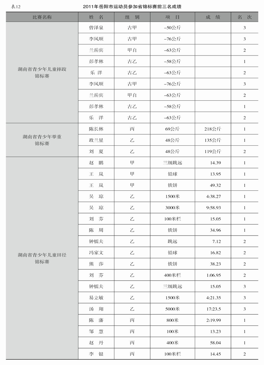 【概况】 2011年初,市体育局成立由局长任组长的备战省十二运会工作领导小组,先后制定出台《岳阳市参加省十二运会备战工作方案》、《岳阳市参加省级以上重大比赛奖励方案(草案)》和《岳阳市引进教练员、运动员实施办法(草案)》等文件,组织召开名老教练座谈会、注册工作会议、“四强”工程整改座谈会、市直在岗在训教练员座谈会。累计全年市本级投入业训经费140多万元。各单位开展运动员选材、输送、注册及裁判员的培训工作,省十二运会岳阳市计划参赛项目训练人数达到60%~80%,有391名运动员参加网上注册登记,队伍注册人数达到60%以上。全年向省专业队等部门输送运动员40人,组织300多人参加羽毛球、乒乓球、篮球等项目的裁判员培训,选派李文等23人参加国家级教练员岗位培训。派出328名运动员参加排球、武术等18个项目的省常年比赛,收获金牌46枚,银牌21枚,铜牌27枚,是近几年来取得的最好成绩。岳阳籍运动员周倩在七城会上夺得摔跤女子组67公斤级冠军,余涛和杨唤在国家奥运举重和射击项目种子选手选拔赛中成绩突出。 (胡义兵)