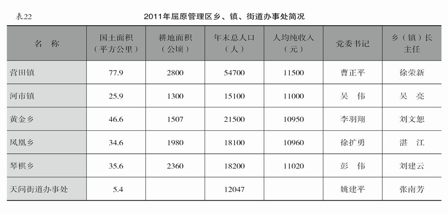 【概况】 2011年,屈原管理区辖3个乡、2个镇、1个办事处,面积218平方公里,耕地面积9000公顷,人口12万人,其中非农业人口6万人,人口出生率8.5‰,自然增长率4.15‰,全年最高气温41℃,最低气温-3℃,年降水量557毫米。