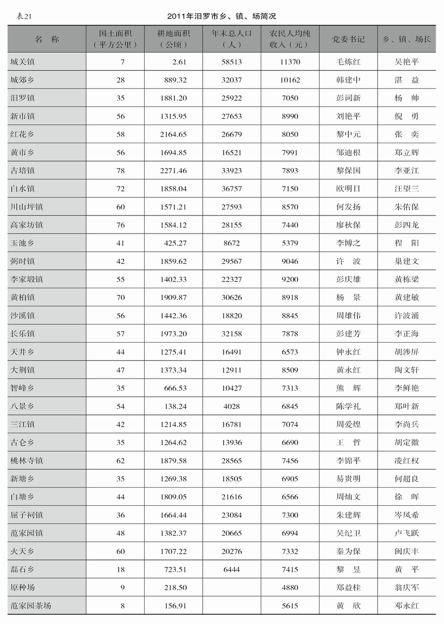 【概况】 2011年,汨罗市辖12个乡、17个镇、2个农林渔茶场、1个办事处。土地总面积1562平方公里,其中耕地面积4.1万公顷。年末总人口669652人,其中,城镇人口93217人,人口出生率11.89‰,人口自然增长率5.95‰。年内最高气温39.9℃,最低气温-4.3℃,年降水量828.3毫米。