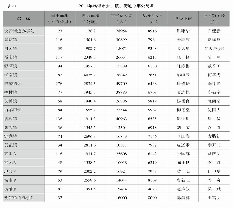 【概况】 2011年,临湘市辖13个镇、5个乡、2个办事处,土地面积1754平方公里,耕地面积3.66万公顷,年末总人口51.31万人,人口出生率13.47‰,性别比为111.43,人口自然增长率6.96‰。年内最高气温39.4℃,最低气温-5.4℃,年降水量1162.3毫米。
