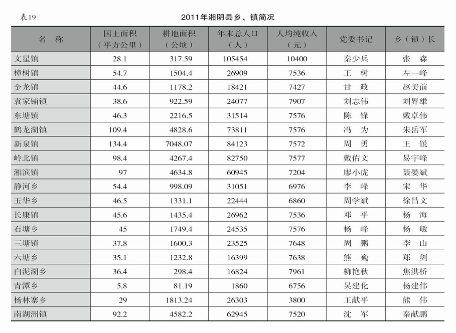 【概况】 2011年,湘阴县辖19个乡镇,土地总面积1581.5平方公里,耕地面积42.05千公顷。年末总人口76.28万人,其中城镇人口12.16万人。人口出生率11.62‰,自然增长率5.8‰。年内最高气温38.8℃,最低气温-3.0℃;年降水量806.7毫米。