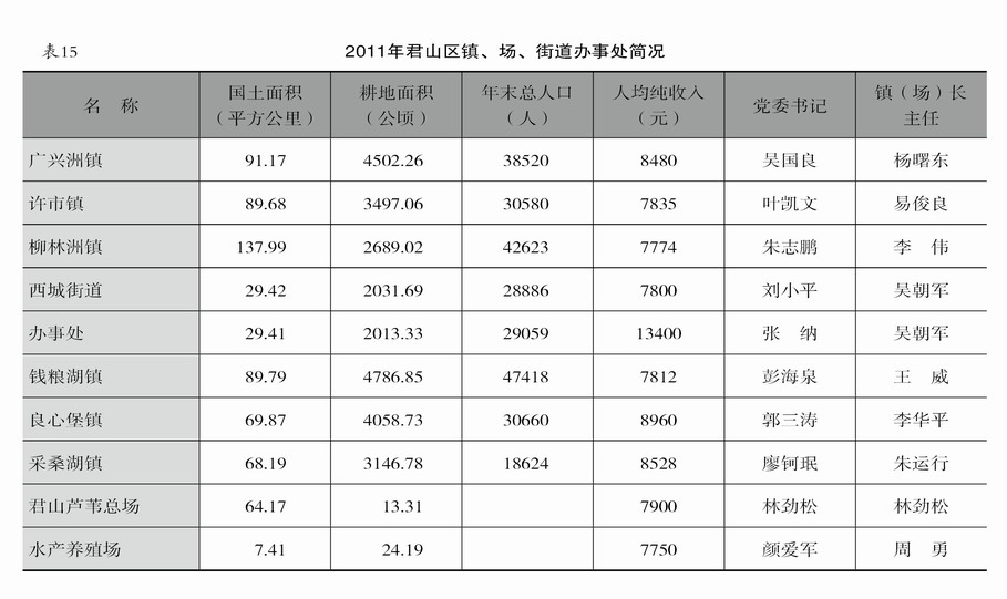 【概况】 2011年,君山区辖6个镇、1个街道办事处和2个场,土地总面积623平方公里,耕地面积26915公顷。年末总人口25.06万,人口出生率10‰,自然增长率5.81‰。年内气温最高38.8℃、最低-2.1℃;年降水量671.2毫米。