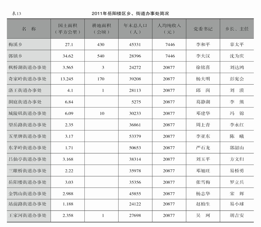 【概况】 岳阳楼区是岳阳市的中心城区。2011年,全区辖2个乡、14个街道办事处。土地总面积为173.7平方公里,耕地面积26.05平方公里。年末总人口55万人,人口出生率为10.28‰,人口自然增长率1.29‰。年最高气温38.8℃,最低气温-2.1℃,年降水量921.6毫米。