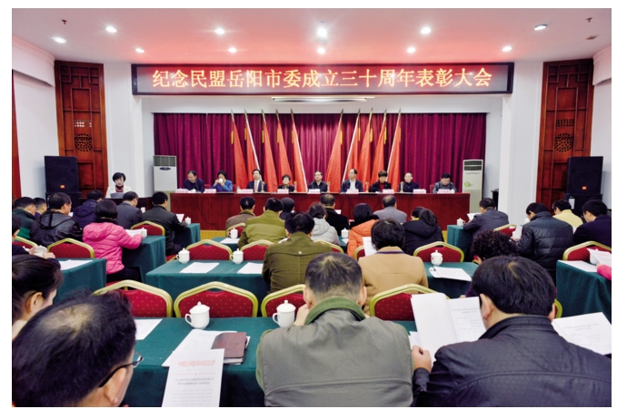 【民盟岳阳市委成立30周年纪念大会】 2013年11月27日,民盟岳阳市委成立30周年纪念大会在晓朝宾馆举行。省政协副主席、民盟省委主委杨维刚、民盟省委专职副主委赵为济,市委常委、市委组织部部长、统战部部长伍国用,市人大常委会副主任陈志莲,市人民政府副市长宋爱华,市政协副主席、民盟市委主委万岳斌出席大会。受表彰的先进集体、先进个人,民盟市委委员、基层支部负责人、各专委会正副主任、盟内人大代表、政协委员和部分盟员代表200余人参加大会。会前组织编撰《民盟在岳阳》一书,加大对岳阳民盟的宣传力度。