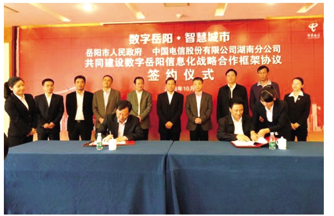 【签约共建“数字岳阳·智慧城市”战略合作协议】 2013年10月25日,岳阳市人民政府与中国电信湖南公司在岳阳市南湖宾馆举行共建“数字岳阳·智慧城市”战略合作协议签约仪式。建设“数字岳阳·智慧城市”是岳阳市委市政府长期坚持的一项发展战略。此次协议的签订,将对提高全市城市智能化水平,规范城市公共管理,加快城市信息化进程产生深远影响。作为岳阳智慧城市建设的主要承接与服务企业,中国电信湖南公司把岳阳作为湖南电信智慧城市示范基地,“十二五”期间,将投入15亿元以上,尽快在岳阳实现城市光网城区100M全覆盖、乡镇20M全覆盖、建制村8M全覆盖、乡镇及以上地区实现3G网络全覆盖,突出建设好智慧政务、智慧旅游、智慧交通、智慧环保、智慧城管、智慧民生等6大示范工程。