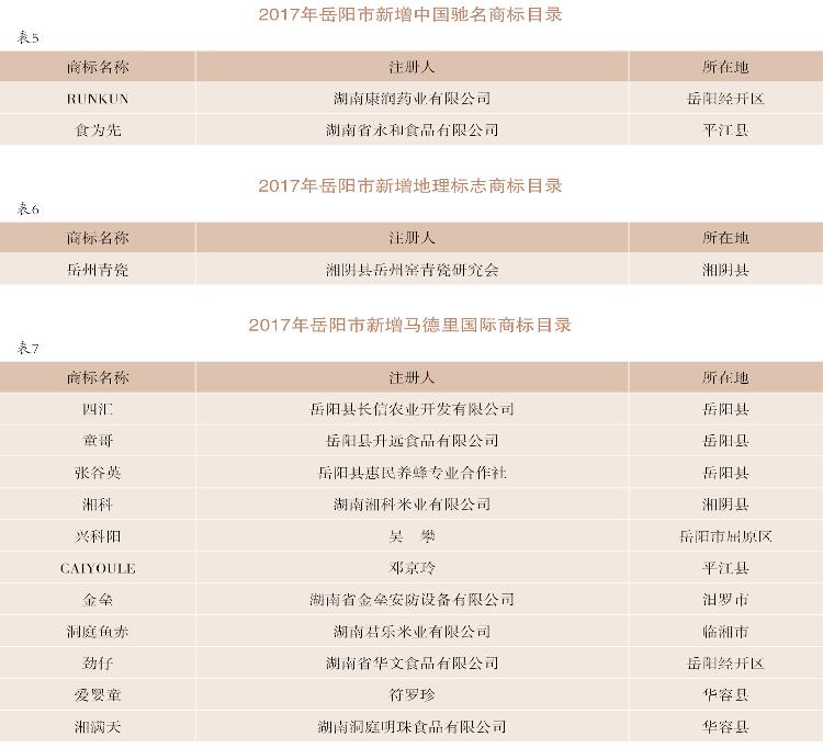 【商标品牌战略】 2017年,市工商局发挥基层商标指导服务站平台作用,推行商标注册“六员”服务。指导市场主体申请认定中国驰名商标2件,注册地理标志商标1件、马德里国际商标7件、普通商标3100件。全市有效注册商标总量(18100件)居全省第三,中国驰名商标(47件)、马德里国际商标(86件)均居全省第二;地理标志商标(15件)居全省第一,商标综合实力在全省排名第二。7月28日,国家工商总局在山东召开“运用马德里体系现场经验交流会”,岳阳市工商局作为全国七个先进典型之一(全省唯一)在会上作经验介绍。