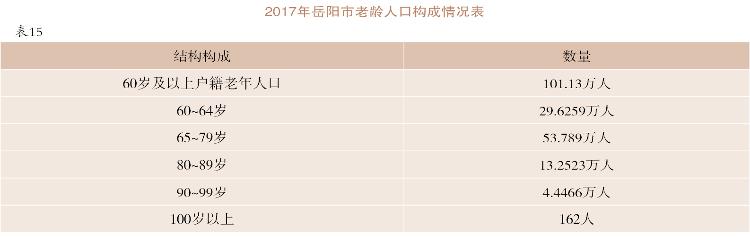 【概况】 2017年,岳阳市60岁及以上户籍老年人口101.13万人,占全市户籍人口的17.64%,同比提高1个百分点。其中,百岁及以上老年人162人(男性29人,女性133人),同比减少3人。发放高龄生活补贴638.4万元,其中,为百岁老人发放长寿保健金77.76万元,为80~89岁低保老人发放高龄生活补贴147.36万元,为90~99岁老人发放高龄生活补贴413.28万元。全市有老年活动站(协会、学校、室)707个,老年养老福利机构1484家,床位数达到35919张。