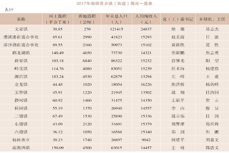 城乡面貌。湘阴县完成社会固定资产投资246.63亿元,升级改造县乡公路57千米、实施农村公路安保工程158千米,临白线新干道竣工通车。国道240湘阴段一年建成通车,新乔线、武警机场公路全线通车,芙蓉大道湘阴段被评为“湖南最美绿色通道”,6.8千米洋沙湖大道和滨江南路高标准改造通车, 漕溪港码头三期基本完工。秋冬修启动水利投资5.5亿元,实施沙田垸和义合垸等堤防加固工程,完成浩河口崩岸、仁山垸等险工隐患处置110多处,疏浚沟渠270千米,冬修水利工作被定为全省会议现场。实施集镇污水处理设施建设三年行动,第一污水处理厂二期完工。推进治水、治气、治砂和洞庭湖综合治理,全县9河14湖全面建立“河长制”,拆除非法矮围网围0.22万公顷,清除欧美黑杨133.33公顷,关停退出畜禽养殖面积5.9万平方米,取缔非法砂场码头18座、入江排污口67处,关闭拆除砖瓦窑厂40家,节能减排任务超额完成,重点生态功能区县域环境质量年度考核排名全省第一。