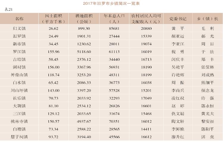 【概况】 2017年,汨罗市辖15个镇、1个办事处,土地面积1562平方千米,其中耕地面积4.1万公顷。年末总人口67.15万人,符合政策生育率97.19%,人口性别比例107.72,自然增长率8.69‰。年内最高气温39.4℃,最低气温-3.2℃,年降水量1729毫米。