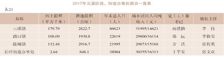 【概况】 2017年,云溪区辖2个镇、2个街道,土地总面积396.2平方千米,耕地面积8700公顷。年末总人口为16.93万人,出生率为15‰,自然增长率为11.1‰。实现地区生产总值138亿元,增长7.1%;规模工业增加值64亿元,增长6.6%;实现消费品零售总额25.21亿元,增长10.2%;完成固定资产投资69.2亿元,增长16.2%;财政总收入10.54亿元,其中,税收收入增长8.6%,税收收入占总收入的比重提高10个百分点;城乡居民人均可支配收入分别为35019元、17860元,分别增长9.7%、8.6%。三次产业比重优化为6.8∶48.3∶44.9,第三产业比重持续提高。