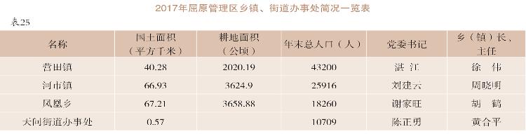 【概况】 2017年,屈原管理区辖2个镇、1个乡、1个街道办事处,土地面积175平方千米,其中耕地面积9300公顷。年末总人口9.8万人,人口出生率12‰,自然增长率5.2‰。年内最高气温36℃,最低气温—9℃,年降水量1633毫米。全年实现地区生产总值89.96亿元,增长6.6%;固定资产投资57.66亿元,增长13.8%;社会消费品零售总额9.9亿元,增长10%;规模工业增加值57.54亿元,增长6.3%;农民人均纯收19377,增长8.6%;城镇居民可支配收入29447元,增长9%;完成公共财政收入1.89亿元,增长12.1%;地方公共财政收入1.28亿元,增长6.8%。获得全国农业先进集体、第一批国家农业可持续发展试验示范区,被评为全省防汛抗灾先进集体、省综治工作先进区,