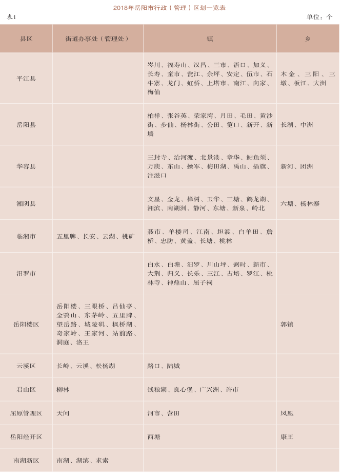 【行政区划】 2018年,岳阳市有乡镇(街道)129个,其中,乡镇103个、街道26个,村1374个、社区461个。经岳阳市人民政府批准,省民政厅备案,对临湘市和云溪区行政区划进行调整。其中,撤销临湘市前长安、五里牌街道,新设立长安、五里牌、云湖3个街道。新设立的长安街道办事处辖长安、围城、三角坪、集庄、麻塘铺5个社区及杨田、荆竹山、路口铺3个行政村;新设立的五里牌街道办事处辖金河、鸿鹤、向阳、南山、五里、新庄、新球7个社区及楠木、松丰、千针、烟冲、花桥、许畈、火炬7个行政村;新设立的云湖街道办事处辖南华、长城、飞跃、桥头、石咀、王禾6个社区及板桥、大岭、三联3个行政村。云溪区云溪街道析置为云溪街道和松杨湖街道。析置后的云溪街道辖槠木桥、洗马塘、镇龙台、凤台山、胜利沟、金盆、汪家岭、安居园、青坡9个社区,新铺、清溪、坪田、桃李、建军、友好、青石、团结、建设、双花、八一11个建制村;松杨湖街道辖擂鼓台、杨树港、茅岭头、菱泊湖4个社区和东风、滨湖2个建制村。