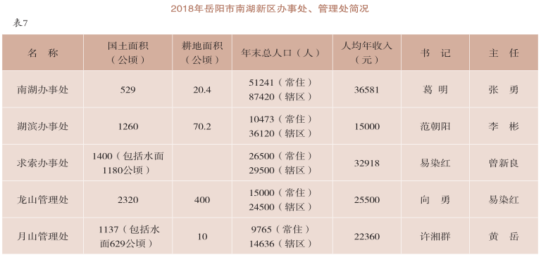 【概况】 岳阳市南湖新区(湖南岳阳洞庭湖旅游度假区)位于岳阳市中心城区南部,现辖面积约56平方千米,区直单位27个、市派驻单位13个,辖南湖、求索、湖滨3个街道和龙山、月山2个管理处,22个社区、2个村。户籍人口8万,常住人口19万。新区是城市南延发展的主战场、主阵地、主力军,具有鲜明的宜居宜业宜游特征。2018年,南湖新区围绕市委、市政府“一三五”基本思路,以“45333”工程为引领,大力践行“一线工作法”,统筹推进各项重点工作,经济社会实现平稳较快发展。