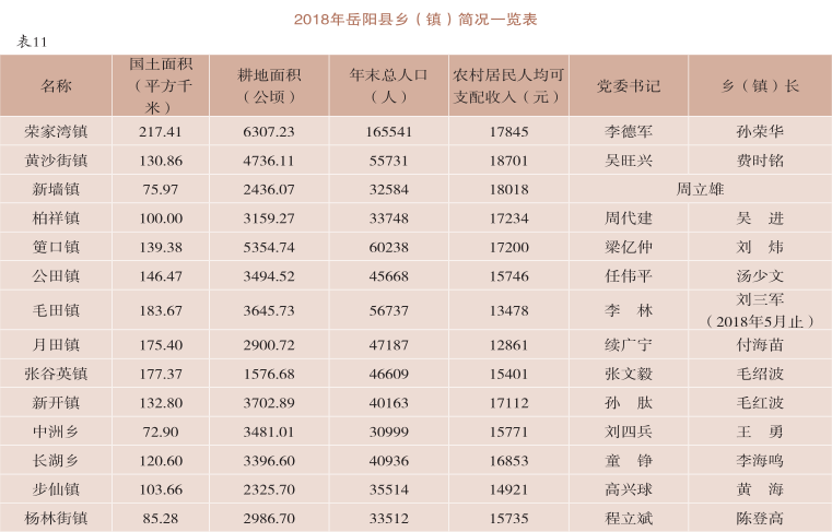 【概况】 2018年,岳阳县辖12个镇、2个乡,土地总面积2809.83平方千米,耕地面积4.99万公顷,总人口72.89万人,其中城镇人口21.93万人,占30.1%,全年出生人口9132人,出生率为12.27‰;死亡人数5158人,死亡率6.93‰;净增人数6116人,人口自然增长率为8.22‰。境内年度最高气温37.1℃,最低气温-3.9℃,全年平均气温18.5℃,年降水量1259.3毫米。