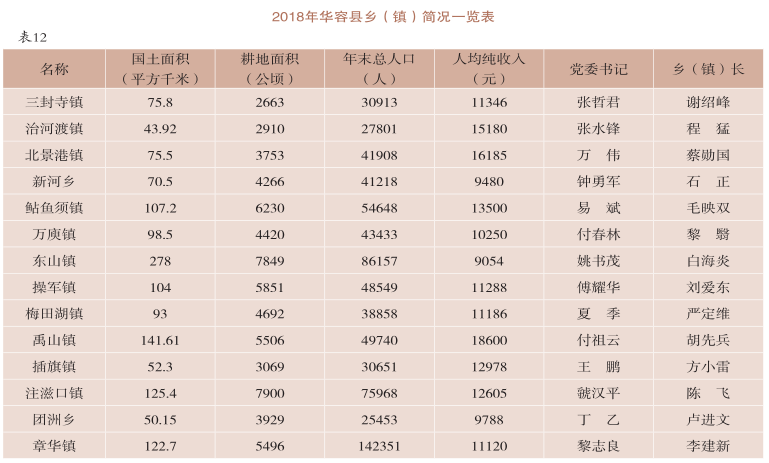 【概况】 2018年,华容县辖12个镇、2个乡,居委会43个,村委会160个,土地总面积1597.1平方千米,绿化覆盖率40.5%。全县全年常住人口73.63万人,其中,城镇人口36.41万人,农村人口37.22万人。城镇化率49.45%。出生8201人,人口出生率10.94‰,人口自然增长3685人,自然增长率4.91‰。年降水量1378.9毫米,日照时数1575.7小时,年平均气温18.3℃。获评全国法治先进县、“中国好粮油”行动示范县、省级出口食品农产品质量安全示范区、省安全生产先进县、省综合治理先进县,通过国家卫生县城、省级园林县城复查验收,继续保持计生优质服务国优和省优、省平安县等荣誉。东山镇获评全国第二批特色小镇。