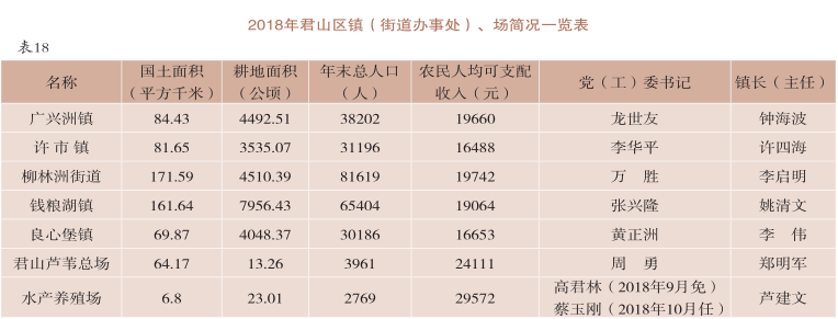 【概况】 2018年,君山区辖4镇1街道办事处2场,土地总面积627平方千米,耕地面积2.69万公顷。年末总人口24.66万,人口出生率11.33‰,自然增长率7.49‰。年内最高气温37.5℃、最低-3℃、平均气温18.5℃;年降水量1680.4毫米。