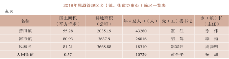 【概况】 2018年,屈原管理区辖2个镇、1个乡、1个街道办事处,土地面积218平方千米,其中,耕地面积9340公顷。年末总人口9.83万人,人口出生率11.12‰,自然增长率3.98‰。年内最高气温38℃,最低气温-3℃,年降水量1322毫米。全区规模工业增加值增长8.5%,公共财政预算收入增长12.6%,城镇居民可支配收入增长8.3%,在六区中排名第二位;GDP增长8.2%,农民人均纯收入增长8.8%,均排名第三位;固定资产投资增长10.9%,排第四位;社会消费品零售总额增长9.5%,高于全市平均水平。