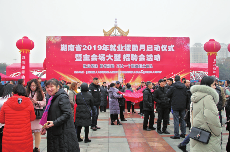 【湖南省“就业援助月”活动在岳阳举行】 2019年1月15日,湖南省2019年“就业援助月”启动仪式暨主会场大型招聘会在岳阳市南湖广场举行。现场1800多名就业者与用人单位达成就业意向,6000多人次享受“311”就业服务,近10万人通过在线直播关注活动进程。主会场招聘现场有500多家企业入场揽人才,提供金融、医药等50多个行业的近万个岗位,主办方组织30辆“就业援助直通车”免费接送。