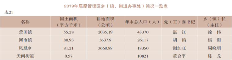 【概况】 屈原管理区位于岳阳市西南部,东经112°55′~113°04′,北纬28°47′~29°08′。2019年,辖2镇1乡1街道,分别是营田镇、河市镇、凤凰乡、天问街道。土地总面积218平方千米,其中耕地9340公顷。年末总人口9.85万人,人口出生率11.02‰,自然增长率3.97‰。年内最高气温38℃,最低气温-5℃,年降水量1232毫米。