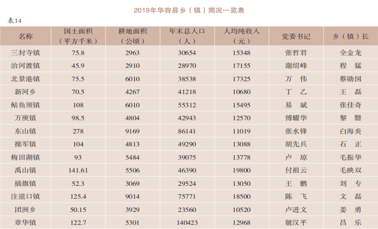 【概况】 华容县位于岳阳市的西北部,经度11218~11301、纬度2910~2948。2019年,辖2乡12镇3个管理区。土地总面积1606平方千米,其中耕地面积1258千公顷。年末常住人口72.17万人,其中城镇人口37.79万人。人口出生率9.43‰,自然增长率5.6‰。年内气温最高38.3℃、最低-4.1℃;年降水量1065.7毫米。森林覆盖率41%。全县已发现矿种2种,其中,非金属矿种1种,水气矿种1种。全年全县总用水量33717万立方米,人均水资源1289立方米。水库74座,年末水库蓄水总量2238.6万立方米,水库总库容6740.8万立方米。治理水土流失面积1.5平方公里。