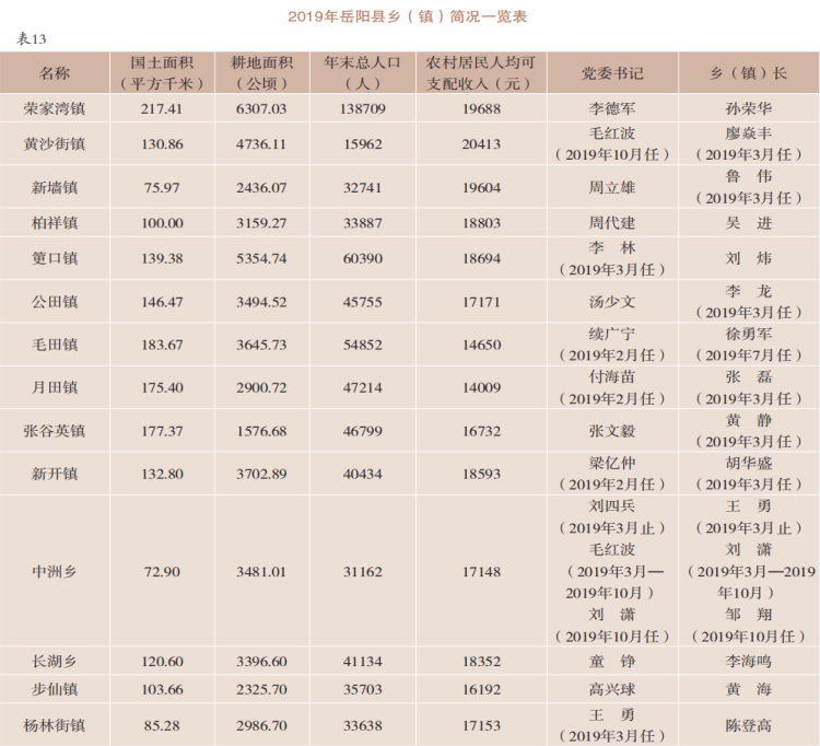 【岳阳县乡村振兴】 2019年,岳阳县创建中国好粮油示范县,划定粮食生产功能区和重要农产品生产保护区5.31万公顷,粮食产量稳定52万吨以上。推进品牌兴农战略,全民鸽业成功创建省特色农产品优质区获评中国农产品地理标志保护产品。天裕农业以兰花萝卜为主的休闲食品,菁华果业以猕猴桃、黄桃为主的鲜果,年产值5亿元以上。惠泰食品以金盆柚为主的系列产品,畅销韩国、日本、欧洲等地,年产值突破1亿元。推行冬季粮油冬种工程,油菜种植面积3.33万公顷以上。推进“空心房”整治和农村人居环境整治集中攻坚行动,拆除“四房”14063栋,面积213.59万平方米,腾地1268公顷。建成30户以上集中建房点24个。植树造林4533公顷。推进农村厕所革命和生活垃圾污水治理,建设一体式化粪池7000多个,建成乡镇集镇污水处理设施10个,治理养殖场所2000多处、黑臭水体1600多处,清理山塘600多口。全县垃圾压缩站实现乡镇全覆盖,农村垃圾无害化处理率100%。实施乡村治理三年行动,推进农村集体资产清产核资,率先在全省落实村级财务按月报账、按月核算、按月上传公开,实现“一村一辅警”全覆盖。193个村(居)委会修订村规民约,持续推进“治陋习、树新风”行动。发展“全域旅游+美丽乡村”模式,张谷英镇入选湖南首批十大特色文旅小镇,七斗堂山庄成功创建省五星级乡村旅游区(点)。推进G240“乡味长廊”建设,举办樱花文化节、油菜花旅游文化节、重阳登高旅游节等节会活动,茶香小镇、岳阳樱花园、霖雾山生态公园、果浓小镇等一大批乡村生态旅游产品相继成型。至年底,接待境内外游客595.79万人次,实现旅游总收入48.87亿元。