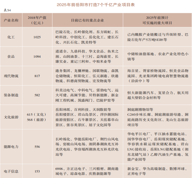 1.做强主导产业。到2025年,在做优做强以巴陵石化、己内酰胺搬迁扩能等为龙头的化工,以中储粮油脂基地等为龙头的食品2个传统千亿产业的基础上,加快培育打造以新金宝项目、华为制造基地等为龙头的电子信息,以恒大新能源汽车等为龙头的装备制造,以长岭炼化、华电平江电厂、国华华容电厂等为龙头的能源电力,以湖南港务集团、综保区等为龙头的现代物流,以岳阳楼、君山岛等为龙头的文化旅游等5个新千亿产业,立起产业发展的“四梁八柱”,加快构建多点支撑、多元发力的现代产业体系。