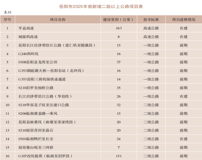 1.拉伸立体交通骨架。综合考虑国家交通发展布局和岳阳未来发展需求,超前谋划荆岳昌高铁、G107岳阳段东移等铁路、高速公路、干线公路项目,协调争取常岳九铁路等已纳入规划项目落地实施,加快平益高速等已开工项目建设,构建“三纵三横”干线铁路网、“四纵两横”高速公路网、“四纵两横”国道网、“五纵七横”省道网,到2025年新增二级以上公路600公里。加快城市环线建设,构建中心城区30分钟交通圈。推动长江干线城陵矶至武汉航道疏浚治理和湘江干线岳阳段疏浚治理,建设松阳湖铁路专业线、华容煤炭铁水联运储配基地铁路专用线、君山荆江大道等疏港铁路、疏港公路,完善港口集疏运铁路公路运输体系。完善三荷机场配套设施,推动三荷机场与周边区域支线机场联动合作;积极开展通用机场规划建设,加强通用航空在抢险救灾、医疗救护、森林消防等领域的应用。
