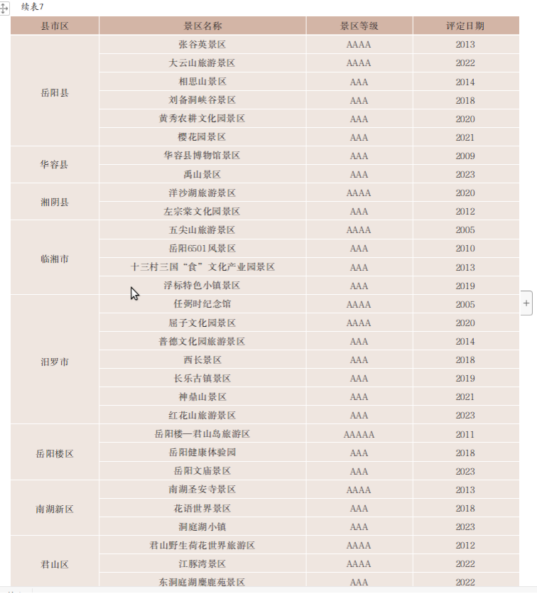 【概况】岳阳市旅游资源丰富,有国家AAAAA级旅游景区1家,国家AAAA级旅游景区12家,国家AAA级旅游景区31家;国家历史文化名镇1处,国家历史文化名村1处,国家级风景名胜区2处,国家级森林公园3处,国家级自然保护区1处,东洞庭湖湿地入选国际重要湿地保护区。