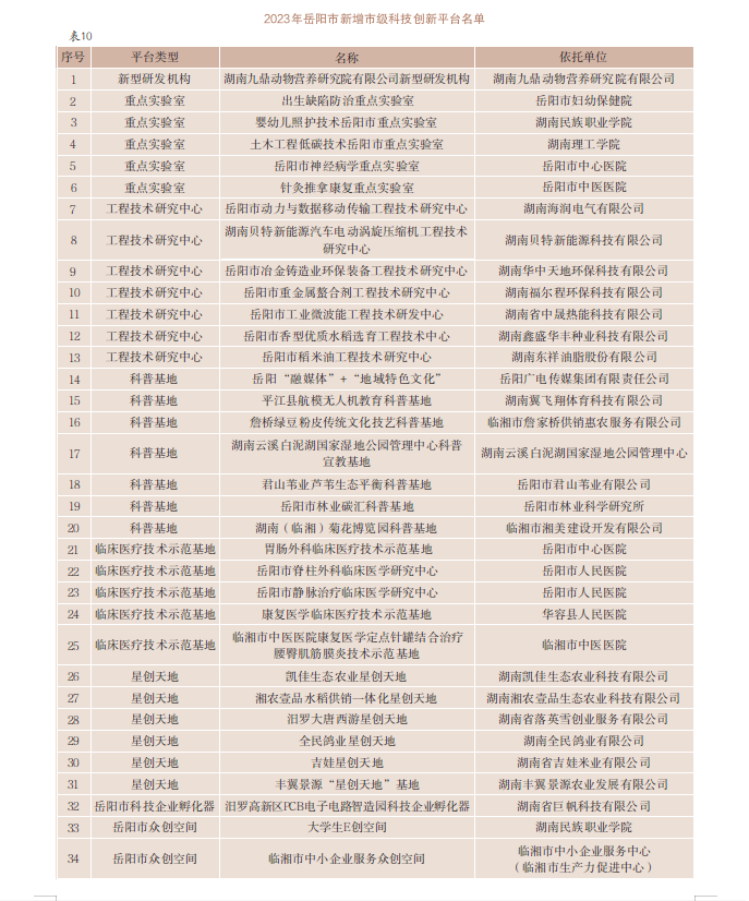 【创新平台建设】2023年,岳阳市加快融入省“四大实验室”,依托市科技事务中心成立实验室服务中心,完善全市创新平台体系建设。洞庭实验室挂牌开工建设,组建汨罗长乐甜酒研发中心和华容芥菜研究中心;湘江实验室区域创新中心围绕数字政府、智慧岳阳等领域;岳麓山种业创新中心洞庭湖区域中心(岳阳分中心)召开首届“看禾选种”现场观摩会暨“岳阳·禾田议事”主题沙龙;芙蓉实验室区域中心筹备建设。依托湖南理工学院、中国科学院过程工程研究所等高校科研机构,成立湖南现代石化产业协同创新研究院,助力湖南现代万亿石化产业集群核心基地建设。新增省级以上创新平台23家,中科电气参与联合共建“电能高效高质转化全国重点实验室”;组建市级创新平台34家,其中,新型研发机构1家、重点实验室5家、工程技术研究中心7家、科普基地7家、临床医疗示范基地5家、科技企业孵化器1家、众创空间2家、星创天地6家。