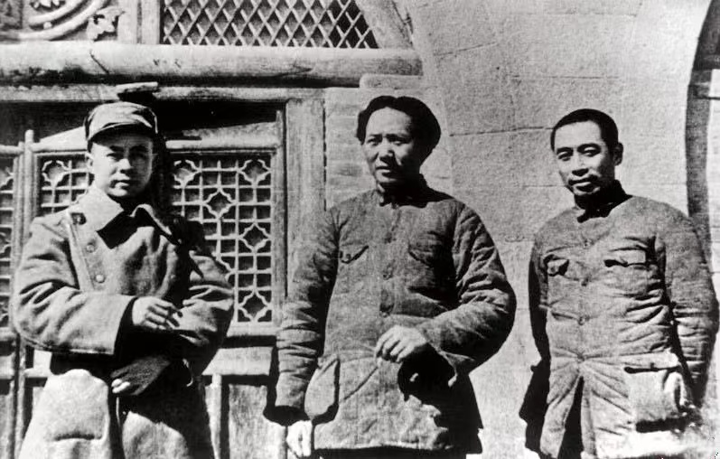 1938年2月,任弼时与毛泽东、周恩来在延安凤凰山窑洞前。