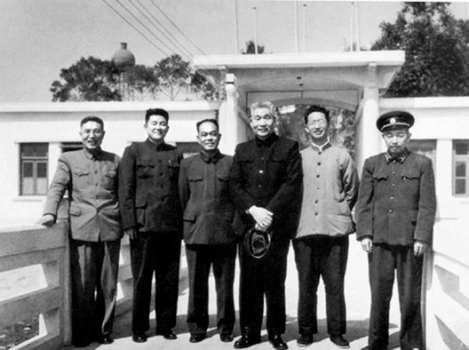 1960年,海军司令员萧劲光(右三)率方正平(右一)等视察南海舰队时合影。