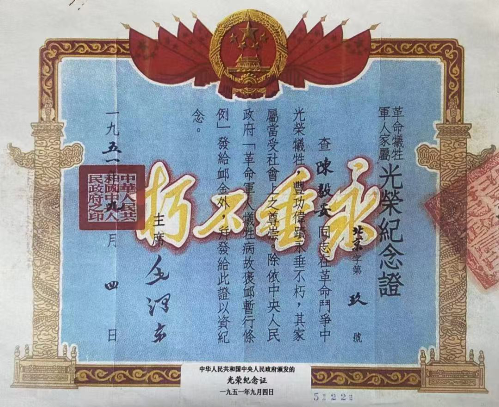 1951年9月4日,毛泽东同志为陈毅安烈士签发的“烈士证”