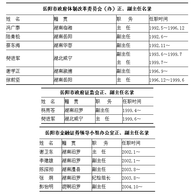 1984年11月,岳阳地区成立体改办,定编12人。岳阳市政府亦成立体改办,定编5人。1985年3月,地区行署成立经研室,与体改办合署办公,实行两块牌子,一套人员,定编12人。1986年,经研室与体改办合署办公,两块牌子,一套人员,定编17人。1992年5月,经研室和体改办分离,体改办升格为正处级,改名为体改委,内设办公室、法规科、复议科、监督科,定编10人。
