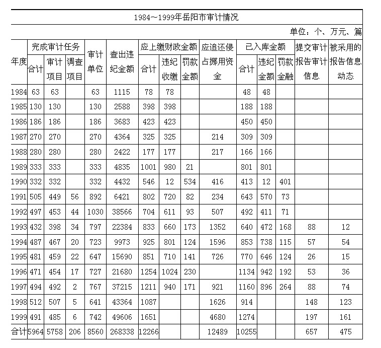 1986年7月,进行第一次审计对象调查,全市共有审计对象3041个,其中工业企业316个,非工业企业1175个,行政事业单位1550个;按区域划分,市属637个、湘阴县425个、汨罗县361个、平江县375个、临湘县281个、岳阳县281个、华容县447个、南区58个、北区97个、郊区 79个。1991年10月,第二次审计对象调查,全市共有2955个,其中工业企业220个,非工业企业725个,行政事业单位1125个,中外合资企业 5个,乡政府、乡财政、区乡供销社及其他单位共880个;按区域分,市属465个、湘阴县383个、汨罗市305个、平江县477个、岳阳县353个、临湘市293个、华容县388个、南区72个、北区133个、郊区86个。