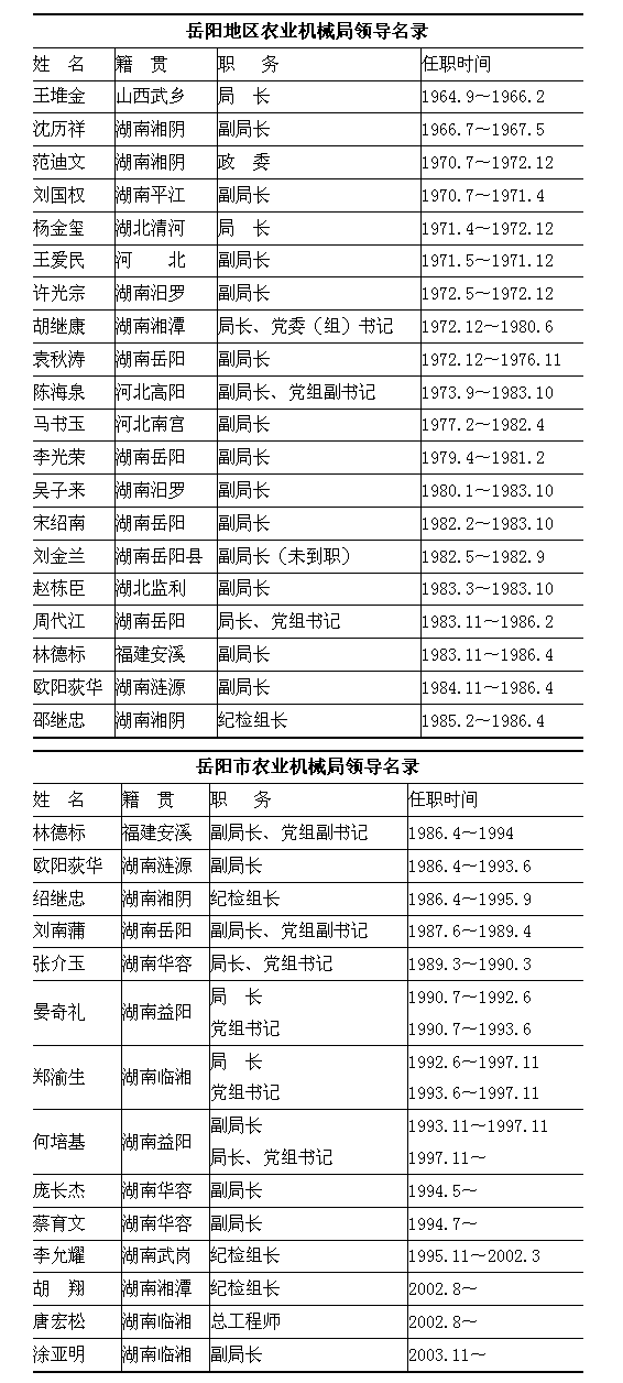1964年9月,成立岳阳专署农业机械管理局, 定编27人,负责农业机械的管理、修配以及技术人员的培训等,设有办公室、拖拉机科、排灌科。“文化大革命”开始后,岳阳专署农机局自然消失。地革委生产指挥组设农机组,取代农机局职能。1970年7月,农机组更名为地区革委会农机水电局,定编5人,负责农机的管理、修配等工作。1972年11月,恢复地区革委会农机局,定编15人,内设秘书科、机械管理科。负责农机管理、修配、供应、生产、科研和技术人员的培训等工作。下辖地区农机公司、地区农机研究所。1979年7月,地区革委会农机局内设秘书科、管理科、生产修配科、财务科、安全科,编制35人。1980年,更名为地区农机局。1982年,地区农机局增设人事科。1983年10月,地区农机局更名为地区农业机械管理站。1984年1月撤销安全科,成立地区农机安全监理所,配事业编制7名。1984 年9月,复更名为农机局。1986年4月,更名为岳阳市农机管理局,内设办公室、政工科、计财科、科教科、管修科;直属单位农机安全监理所,共有职工52 人,其中技术干部32人。